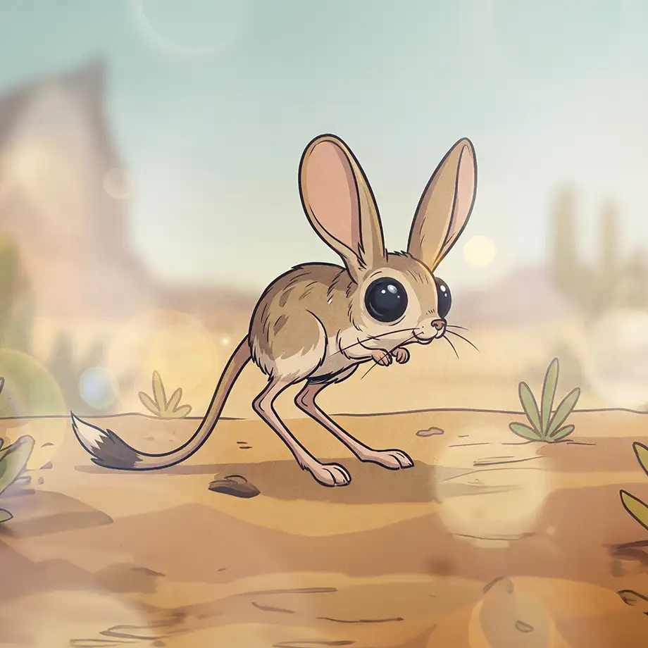Die Jerboa – auch Wüstenspringmaus – ist bekannt für ihre Sprungkraft, ihre Orientierung in komplexem Terrain und ihre außergewöhnlichen Sinne. Mit großen Ohren und scharfem Blick nimmt sie ihre Umgebung präzise wahr und kommt mit wenigen, gezielten Sprüngen schnell voran.