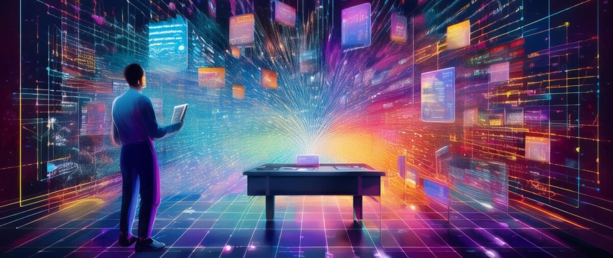 Eine futuristische Darstellung von einem Tisch, von dem aus viele verschiedene Lichtstränge ausgehen, undeutlcihe Screenshots im Hintergrund, eine Person, die auf die Lichtstränge und Screenshots schaut